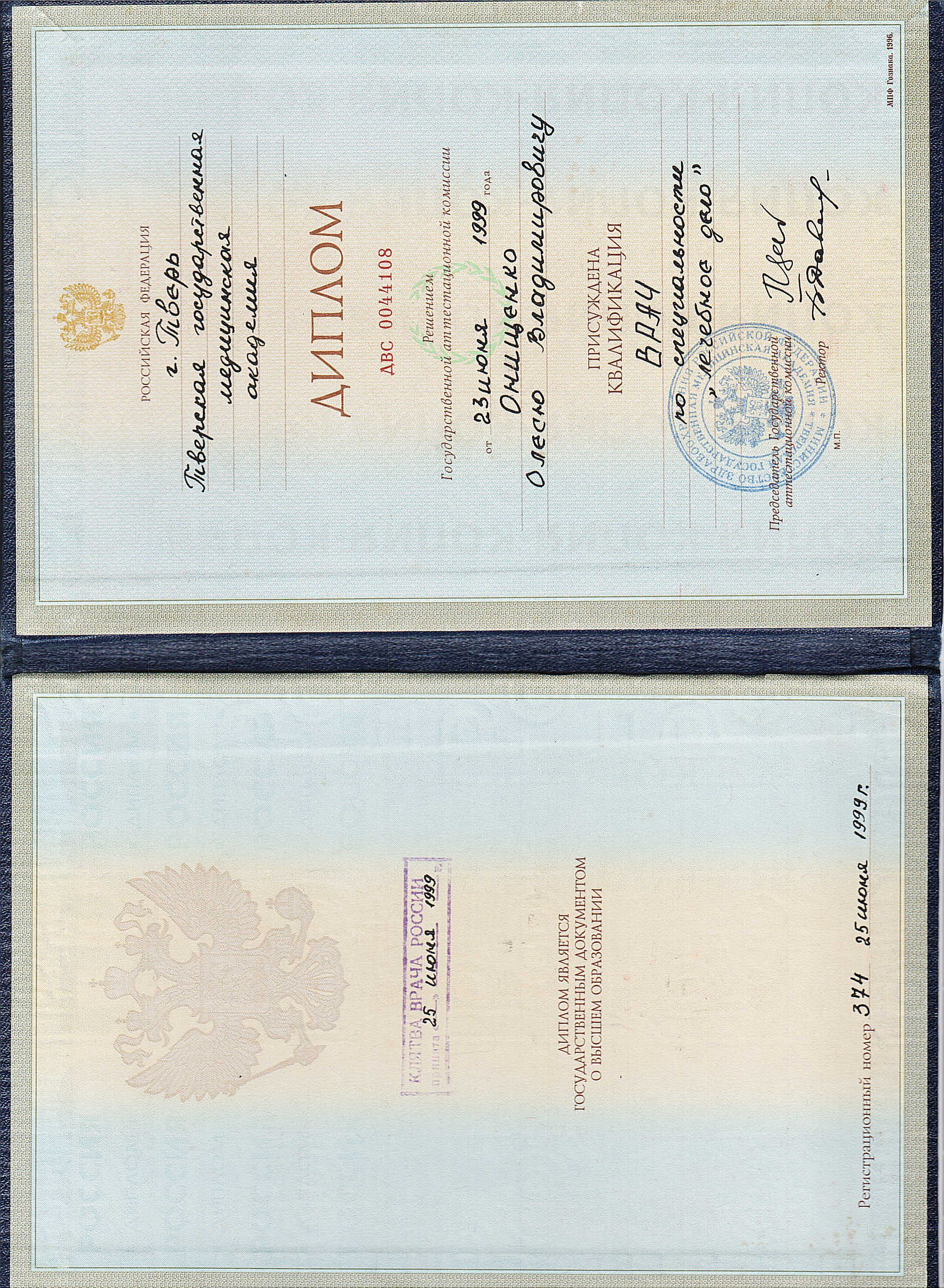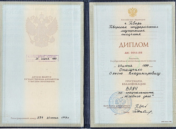 - 1999 г. - Медицинский факультет «Лечебное дело», Тверская ГМА;