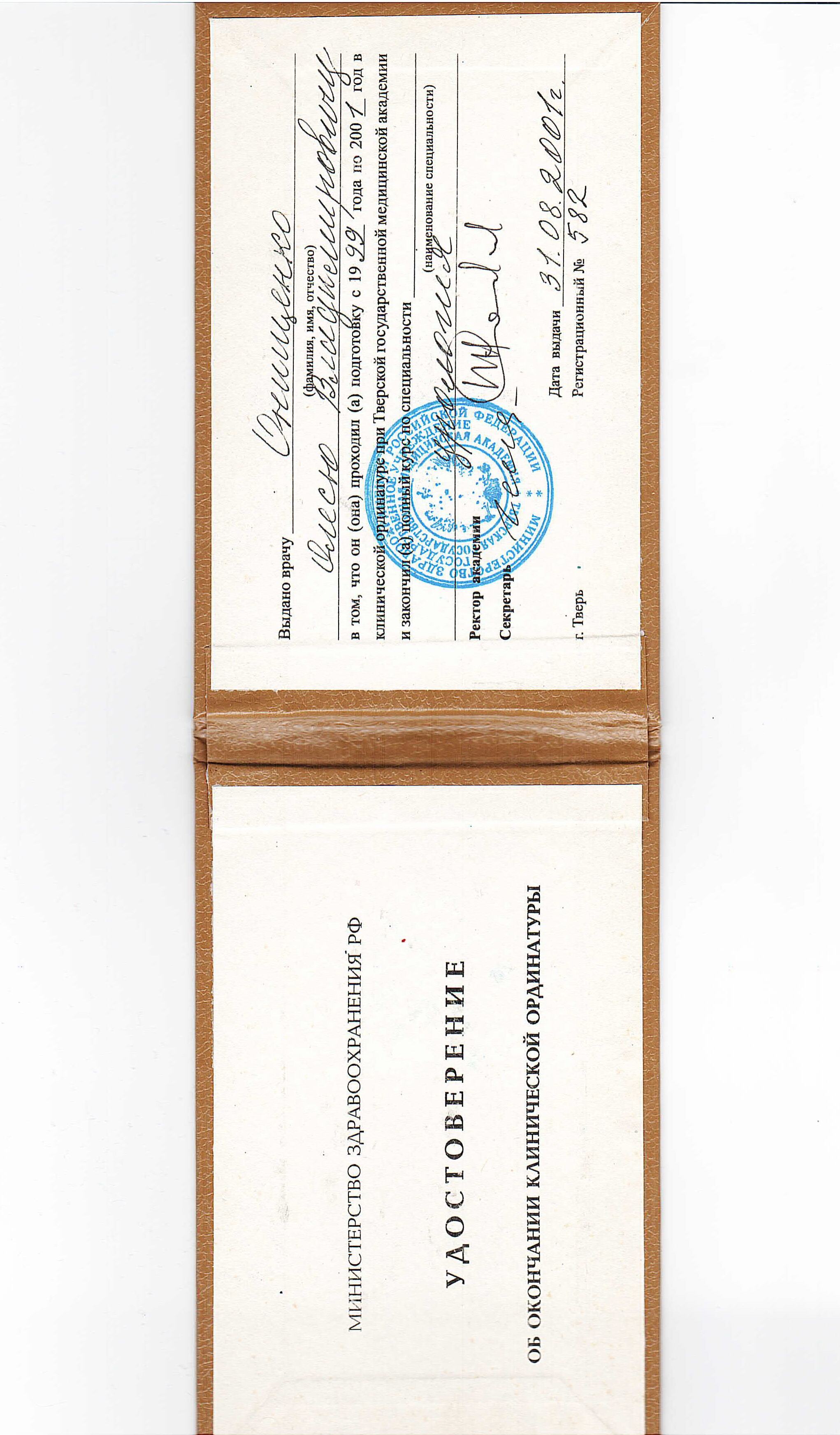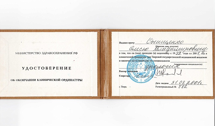 - 2001 г. - Ординатура по специальности «Урология», Тверская ГМА;