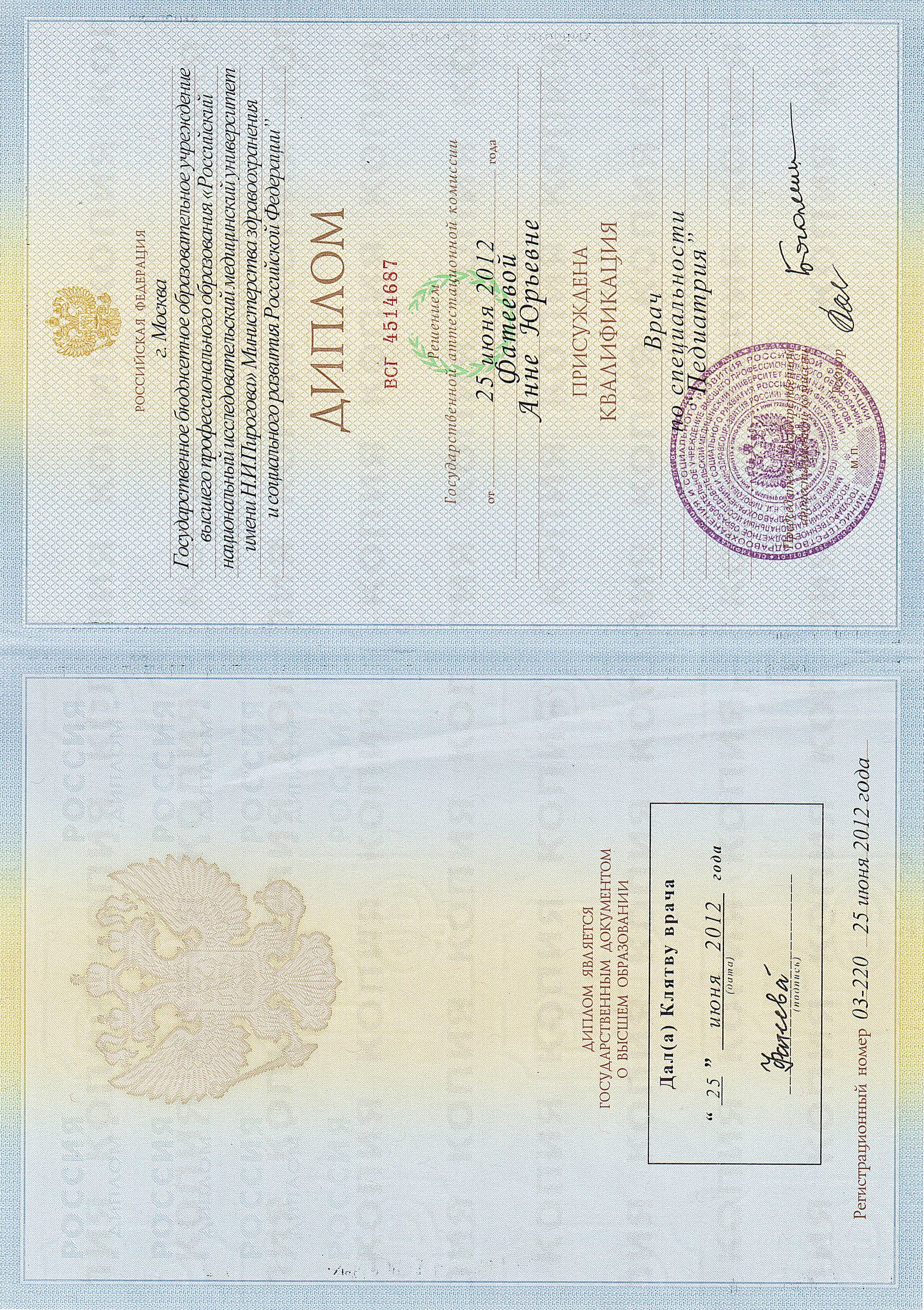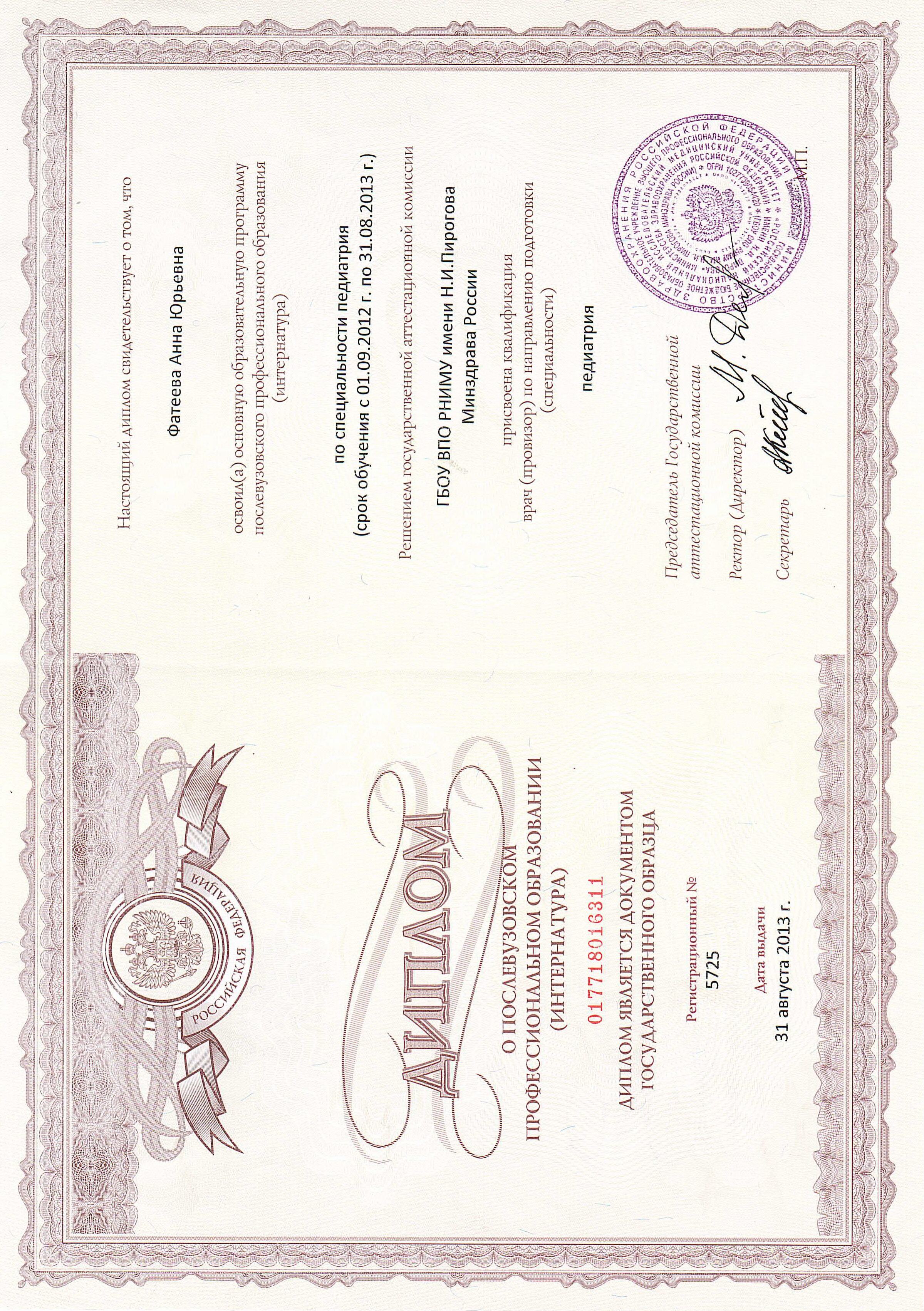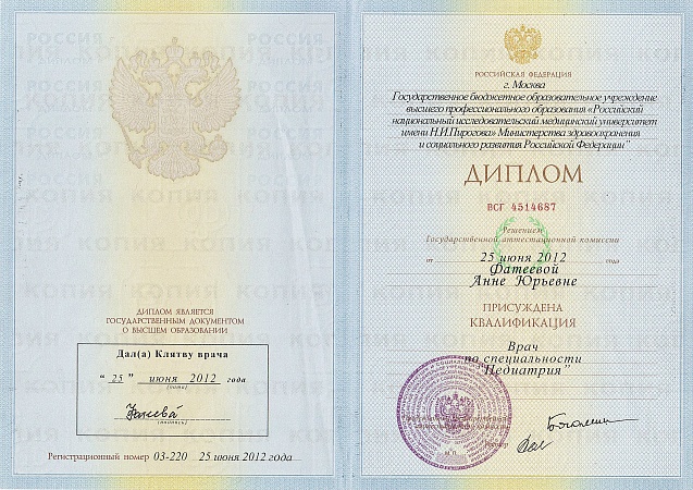 - 2012 г. - ГБОУ ВПО РНИМУ им. Н.И. Пирогова по специальности «Педиатрия»;