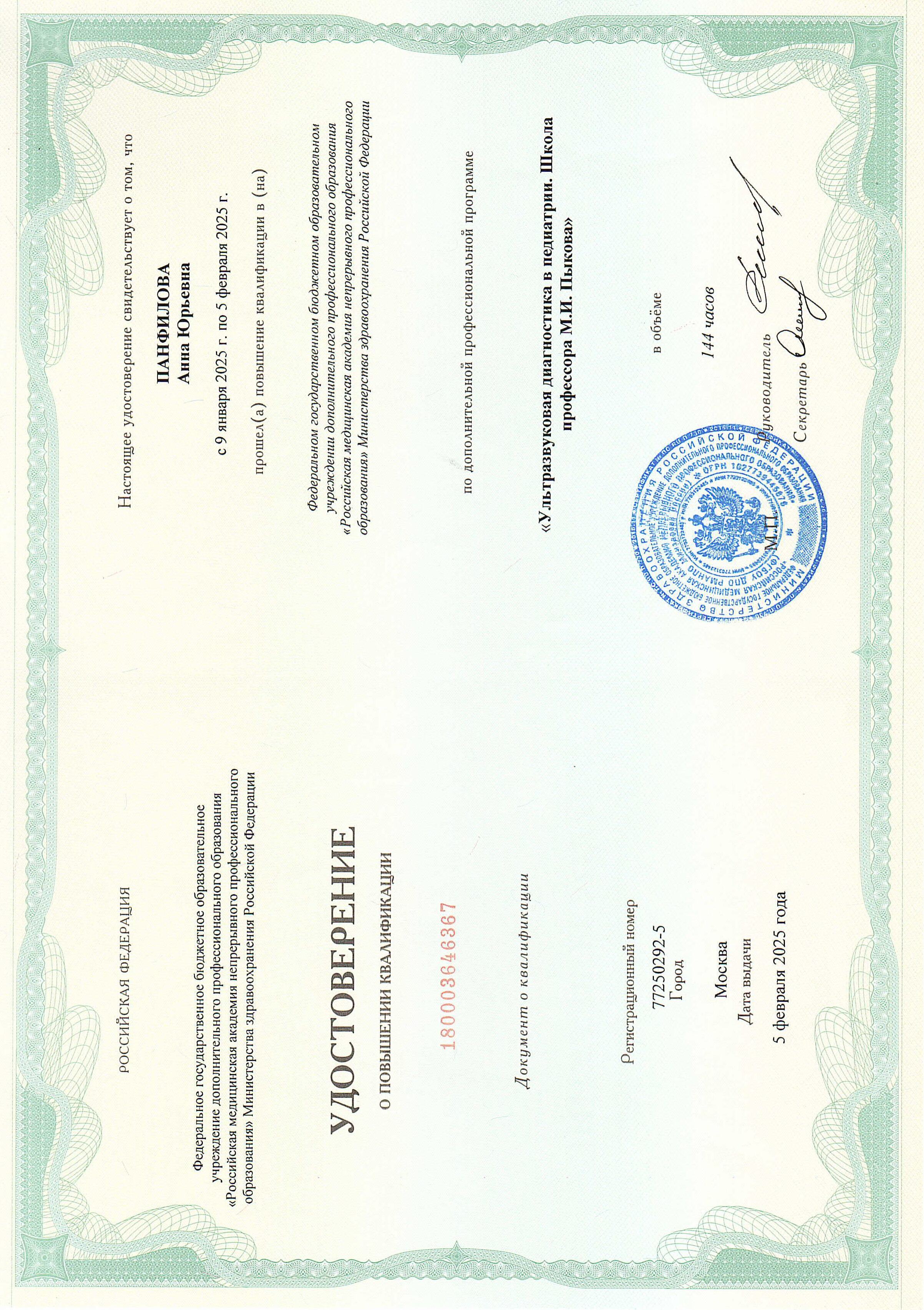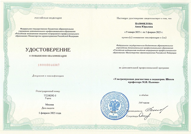 - 2025 г. - Российская медицинская академия непрерывного профессионального образования. Повышение квалификации по специальности «Ультразвуковая диагностика в педиатрии. Школа профессора М.И. Пыкова».