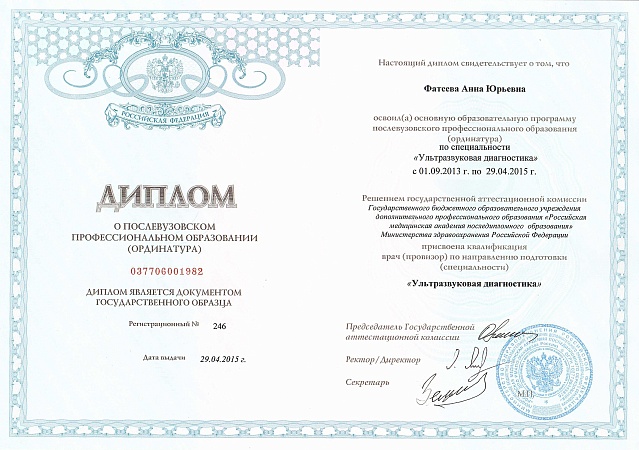 - 2015 г. - ГБОУ ДПО РМАПО МЗ РФ. Клиническая ординатура по специальности «Ультразвуковая диагностика».