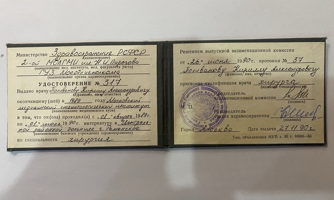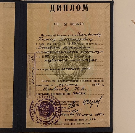 - В 1989 году закончил лечебный факультет Московского медицинского стоматологического института им. Н.А. Семашко по специальности лечебное дело.
