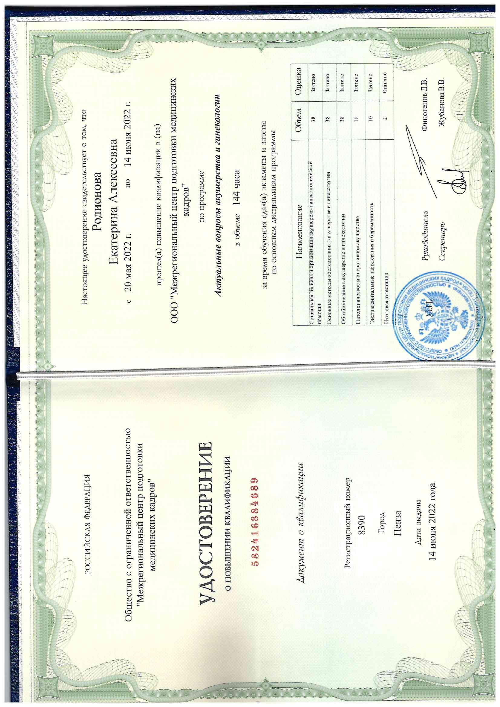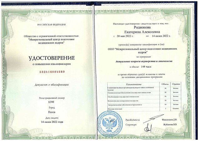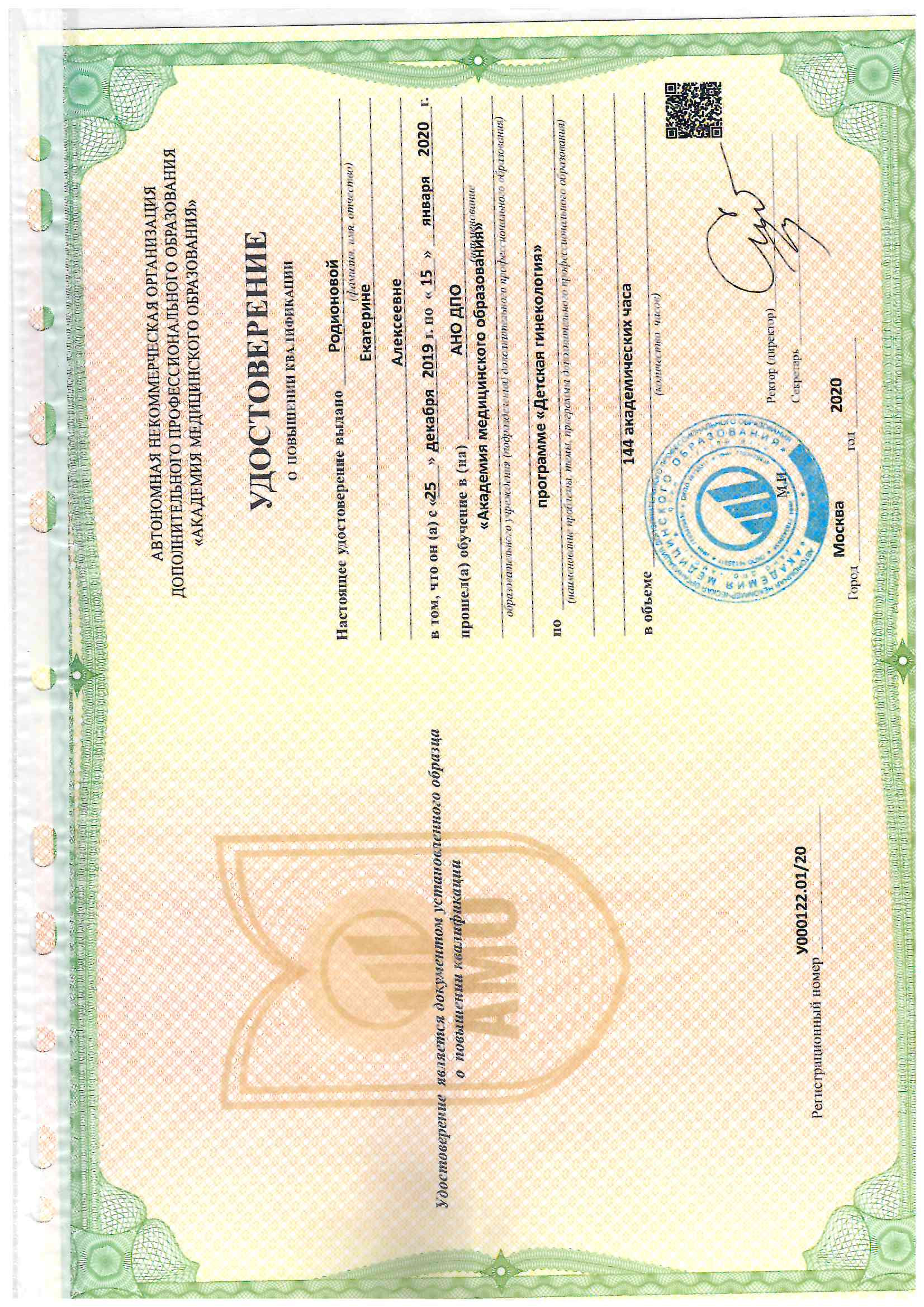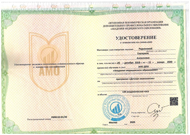 - 2020 г. - Академия медицинского образования. Повышение квалификации по специализации «Детская гинекология».