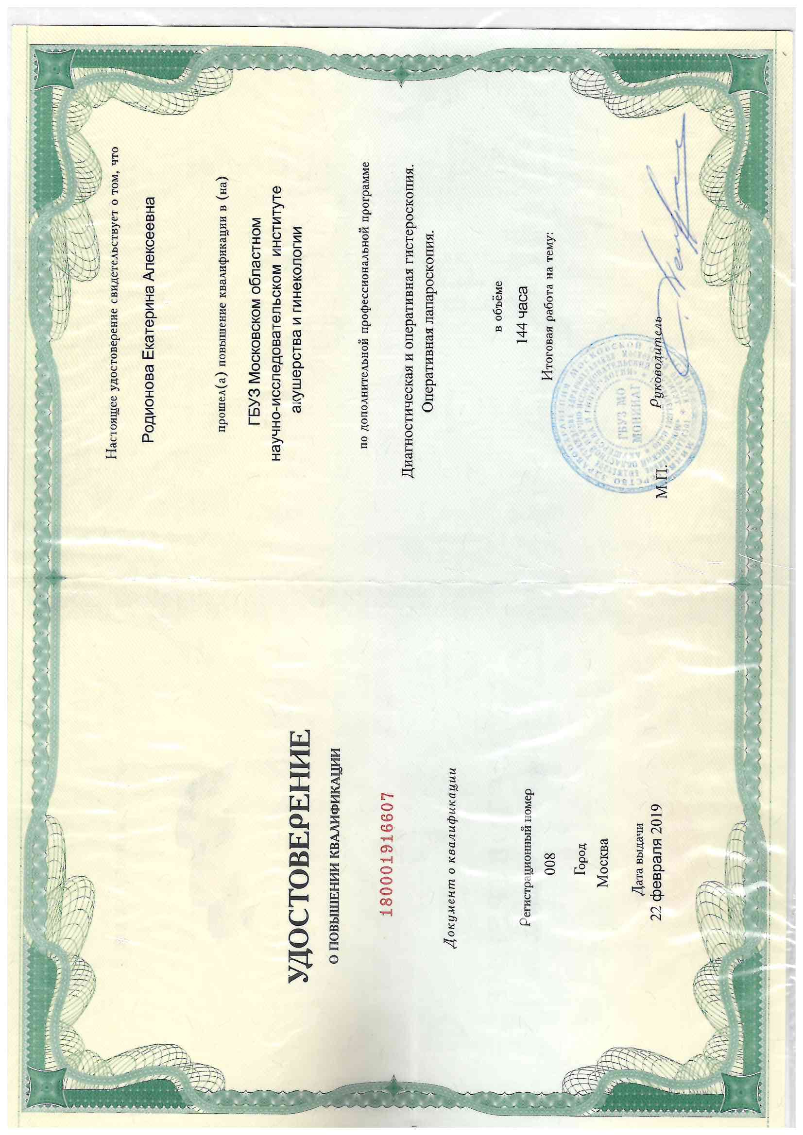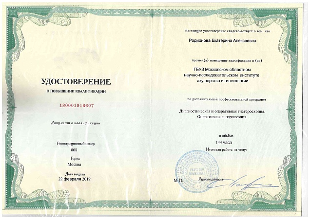 - 2019 г. - Повышение квалификации в ГБУЗ МО МОНИКИ им М.Ф. Владимирского по дополнительной проф. программе «Диагностическая и оперативная гистероскопия. Оперативная лапароскопия»;