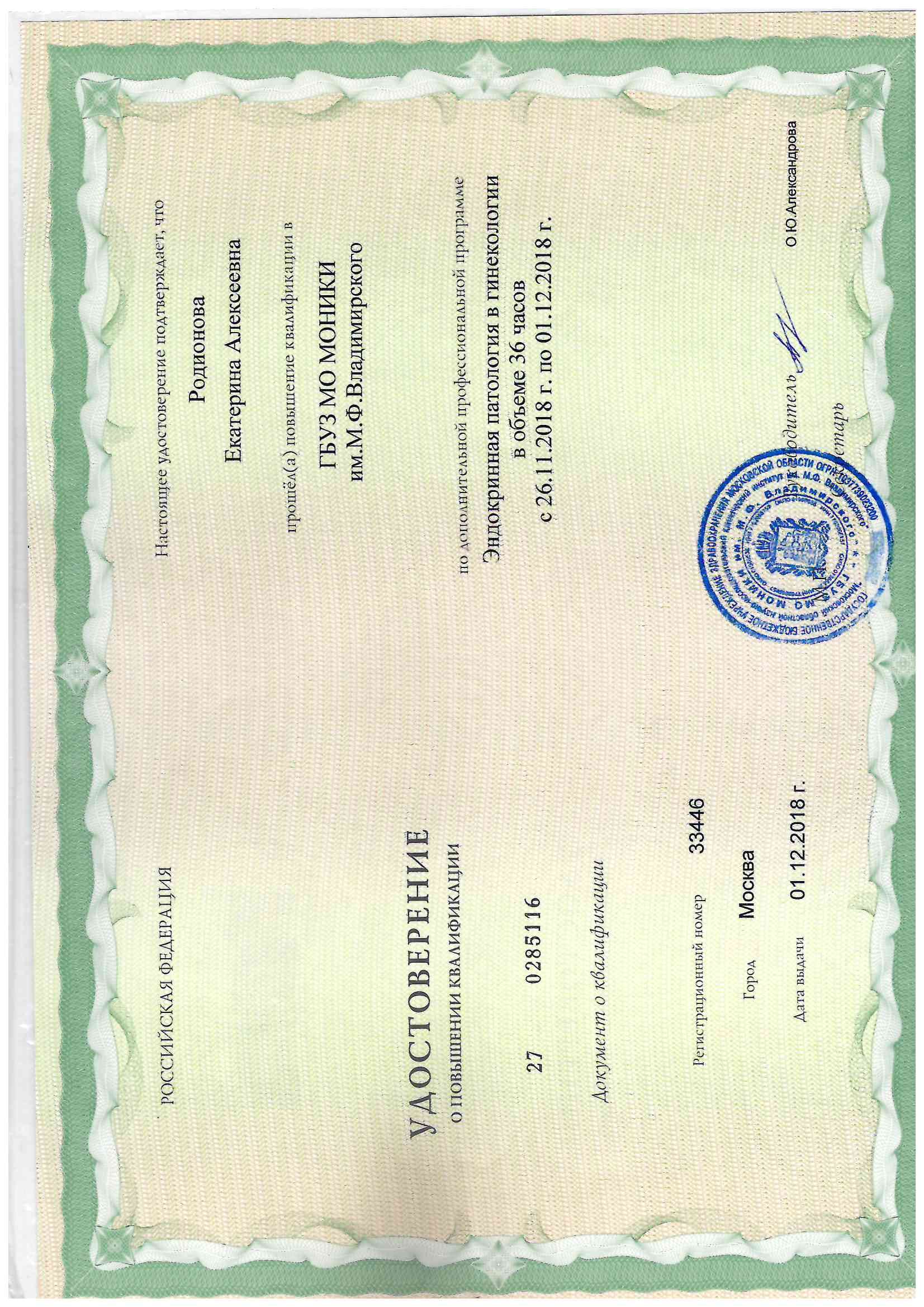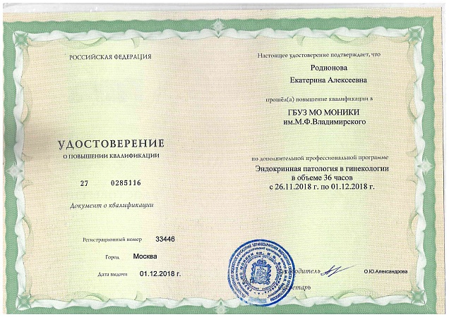 - 2018 г. - Повышение квалификации в ГБУЗ МО МОНИКИ им М.Ф. Владимирского по дополнительной проф. программе «Эндокринная патология в гинекологии»;