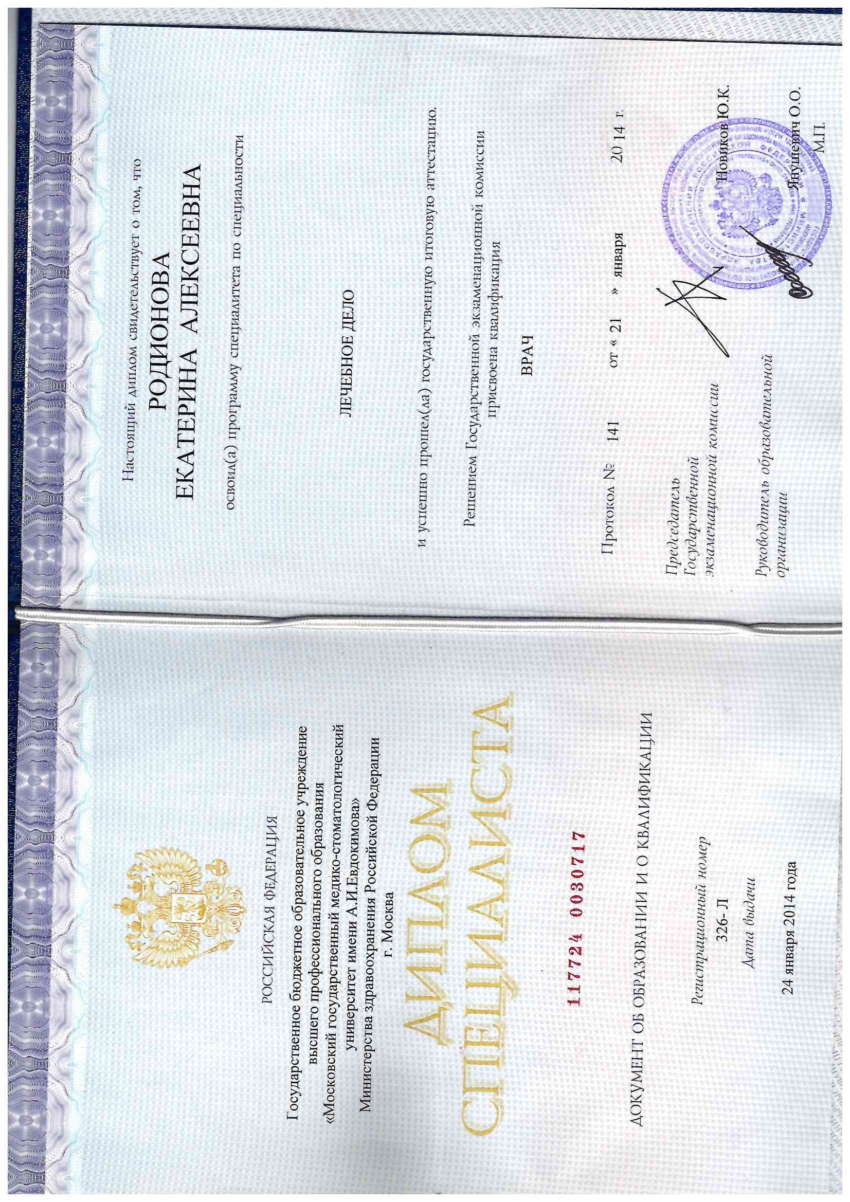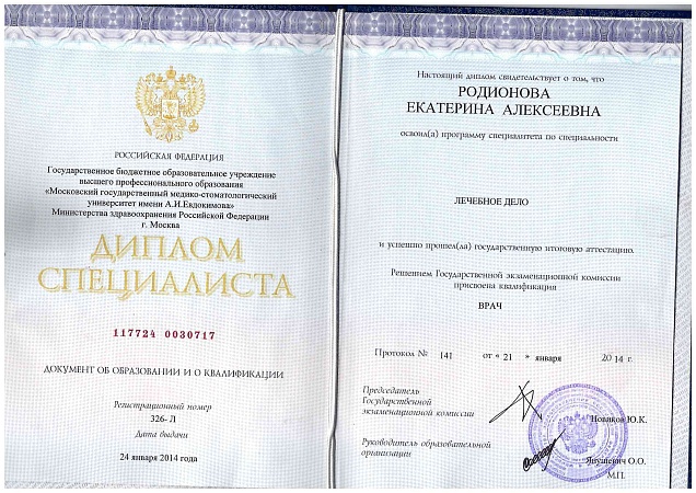 - 2014 г. - МГМСУ им. Евдокимова по специальности «Лечебное дело»;
