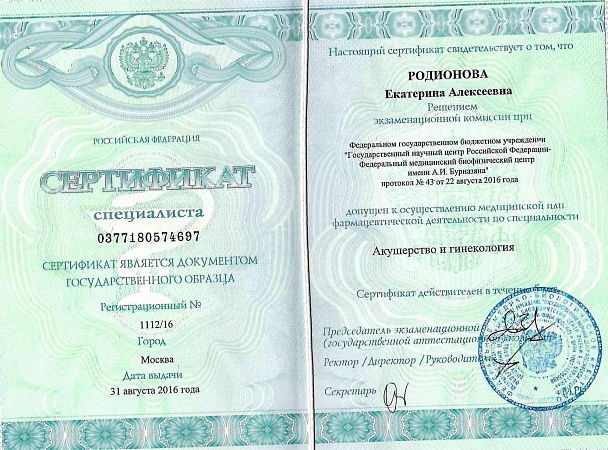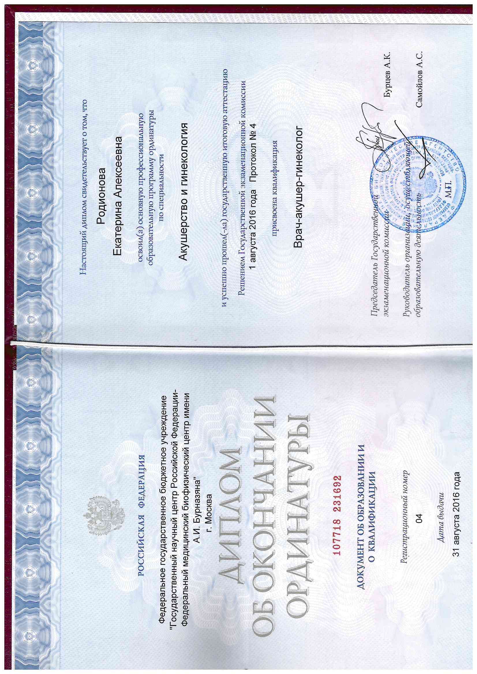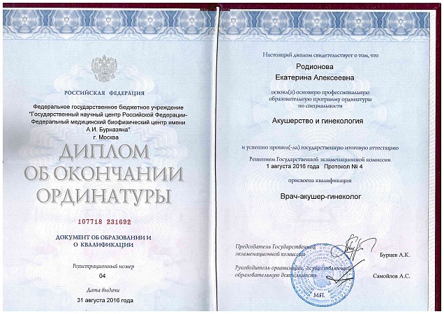 - 2016 г. - Клиническая ординатура по специальности «Акушерство и гинекология».