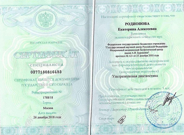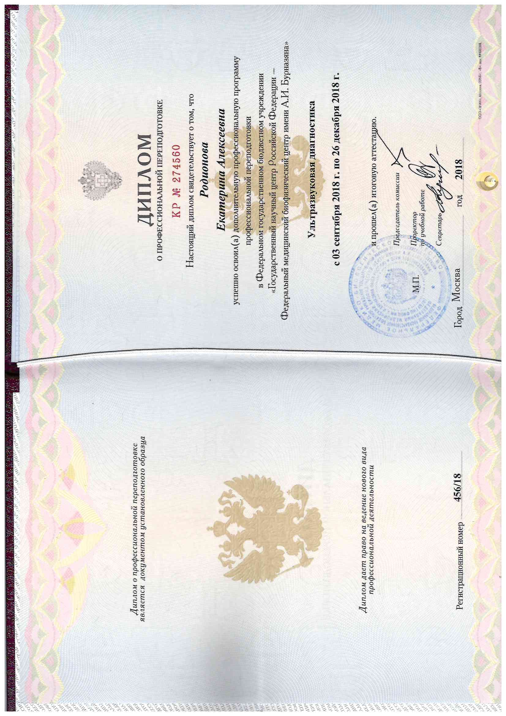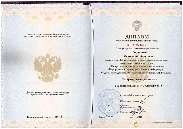 - 2018 г. - ФГБУ им. Бурназяна. Профессиональная переподготовка по специальности «Ультразвуковая диагностика»;