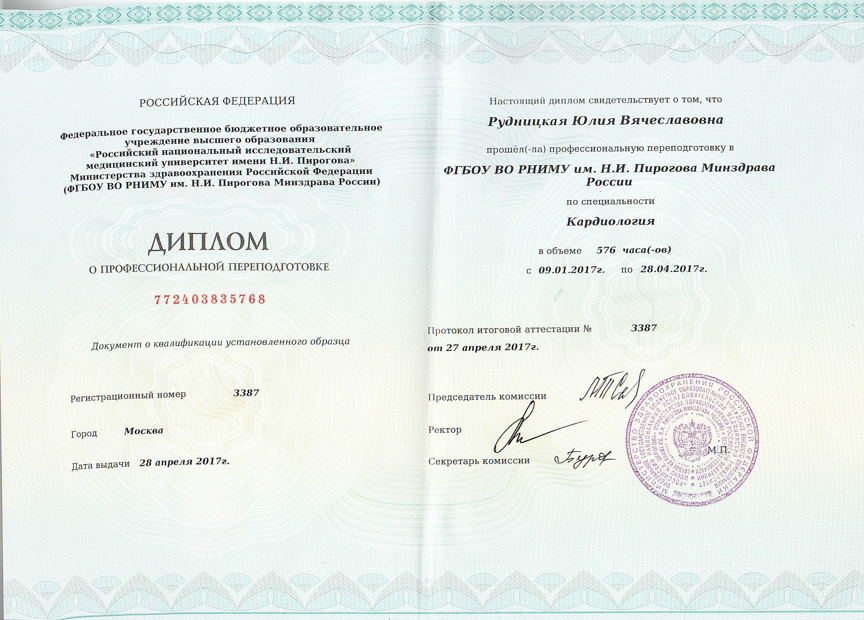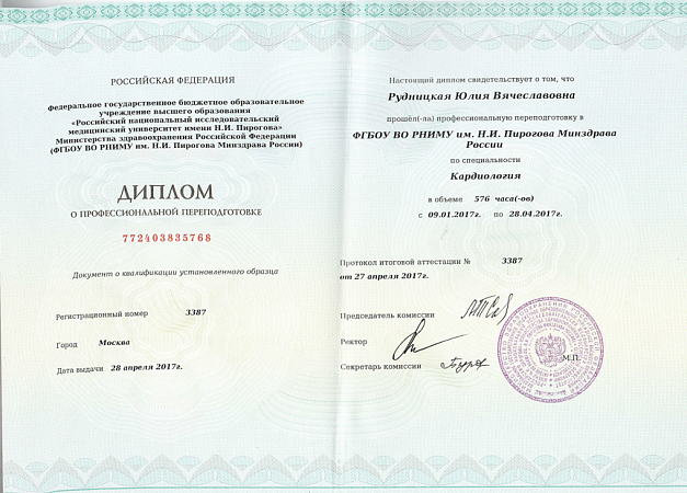 - ФГБОУ ВО "РНИМУ им. Н.И. Пирогова Минздрава России", г. Москва. Профессиональная переподготовка по специальности "Кардиология" (2017 г)