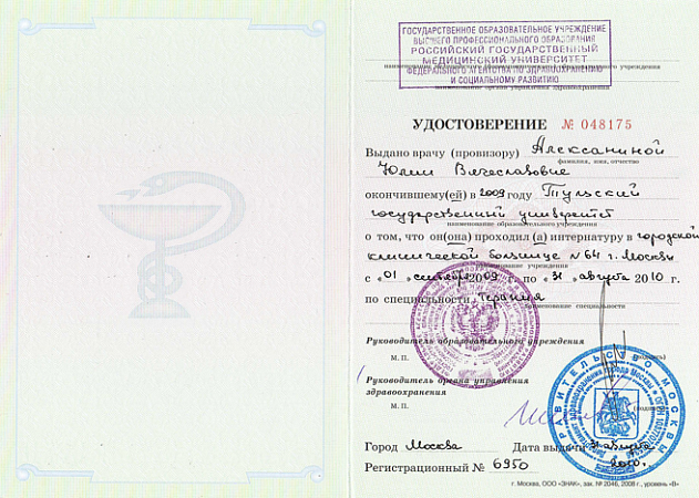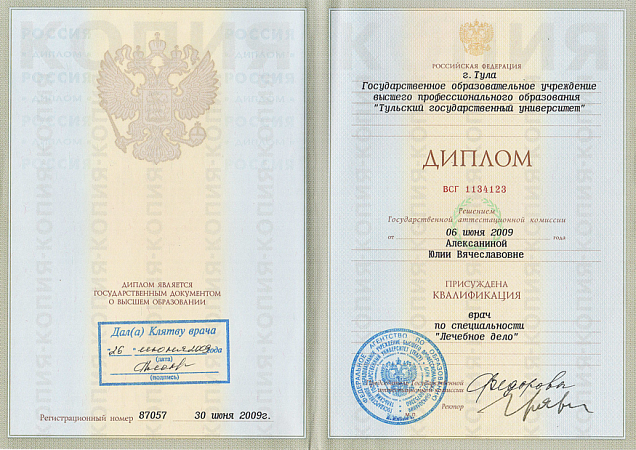 - Диплом по специальности "Лечебное дело", Тульский государственный университет (2009 г.)