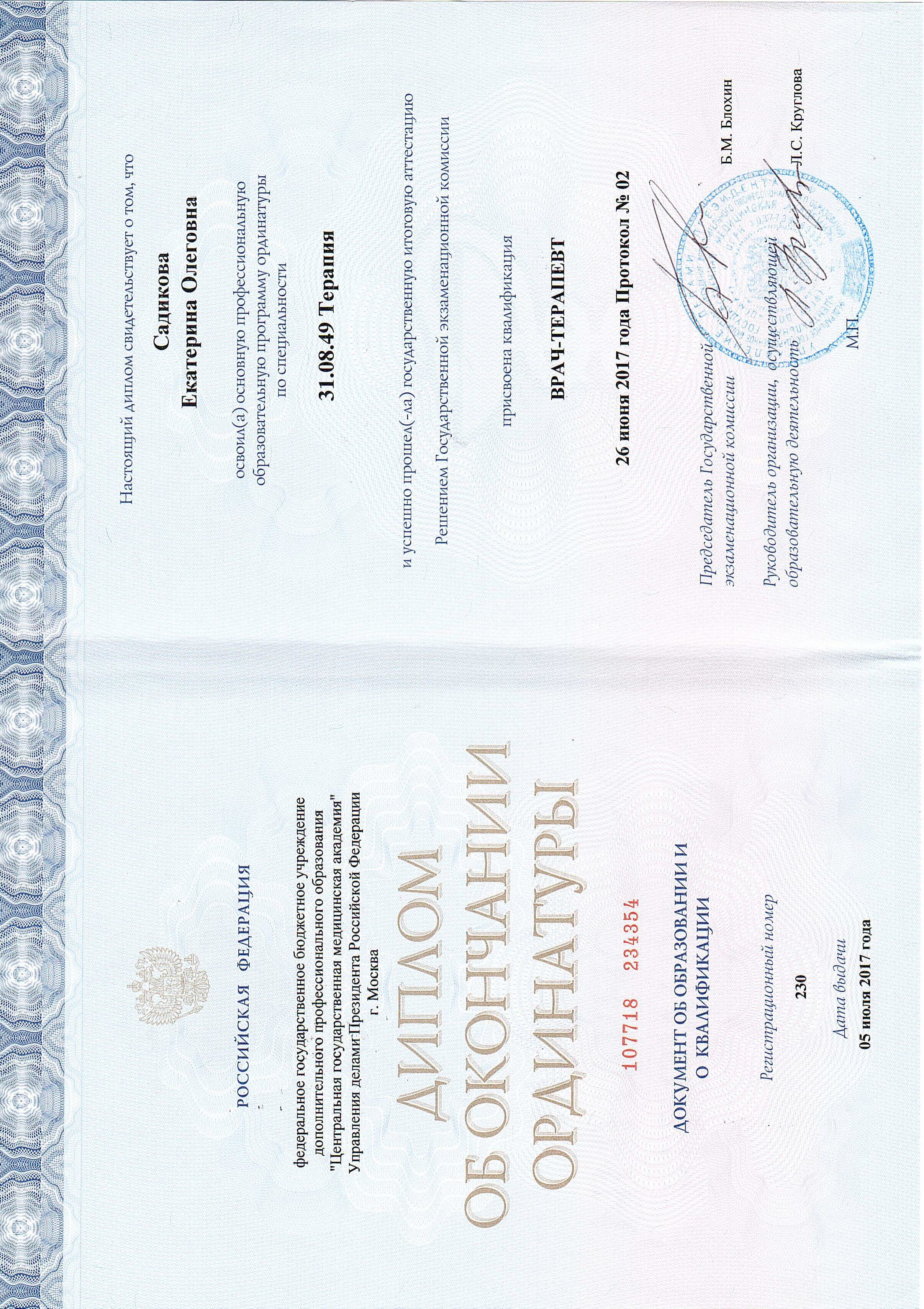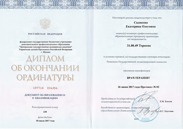 - 2015-2017 гг. - Клиническая ординатура на базе Центральной государственной медицинской академии Управления делами Президента РФ, городской клинической больницы № 51, специальность «Терапия»;
