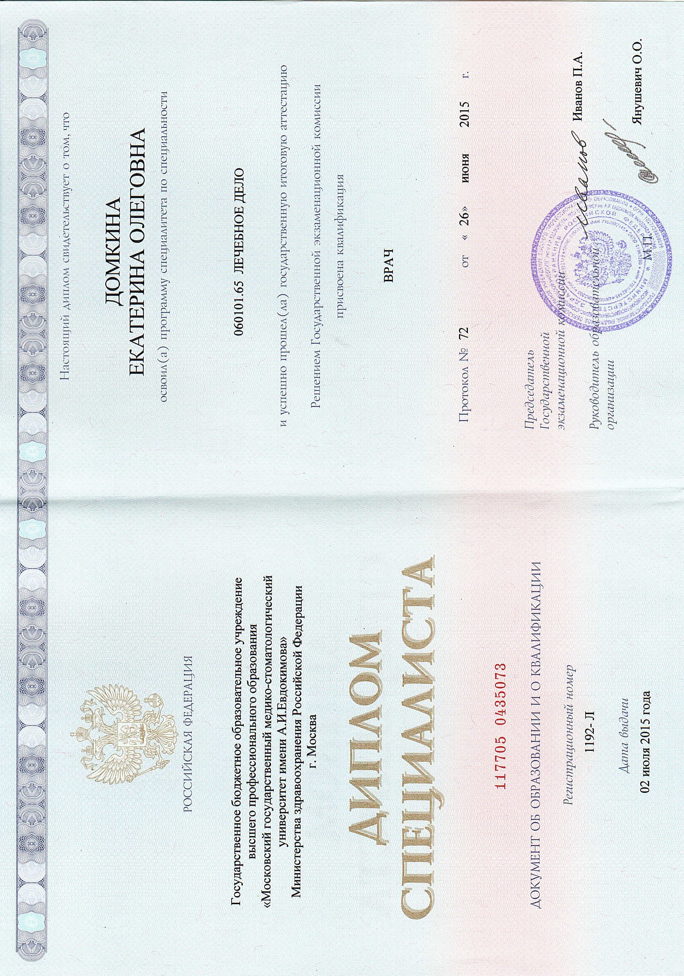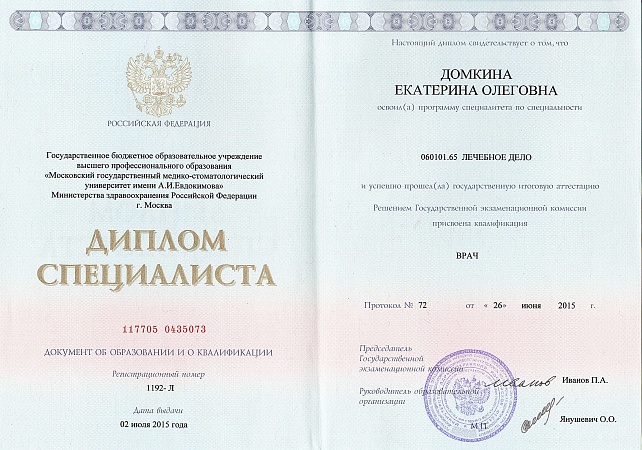 - 2015 г. - Московский государственный медико-стоматологический университет им. А.И. Евдокимова, специальность «Лечебное дело»;
