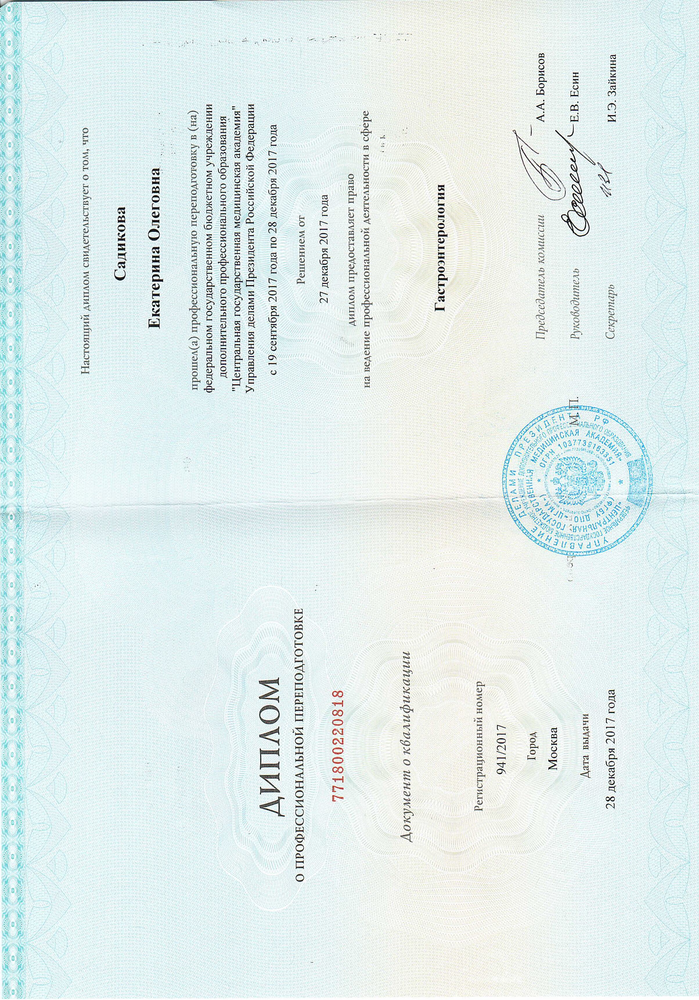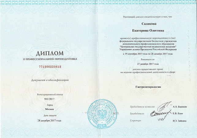 - 2017 г. - Профессиональная переподготовка на базе Центральной государственной медицинской академии Управления делами Президента РФ, по специальности «Гастроэнтерология».