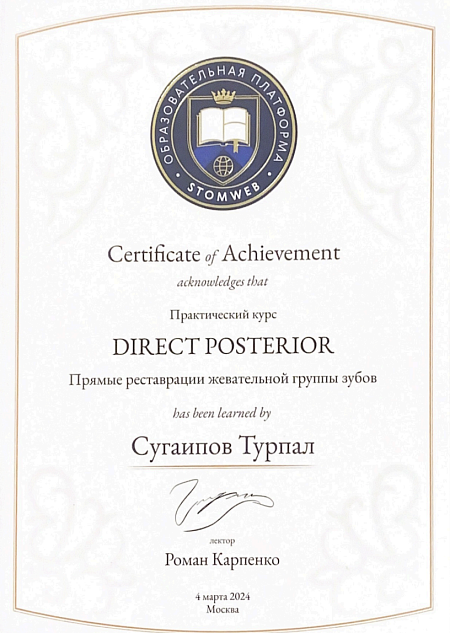 - В 2019-2021 гг. проходил обучение в клинической ординатуре по специальности «Стоматология хирургическая» ФГБУ ДПО «Центральная государственная медицинская академия» Управления делами Президента Российской Федерации;