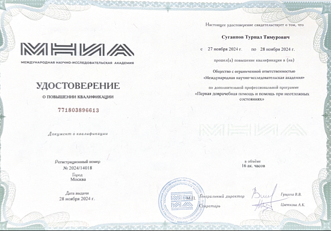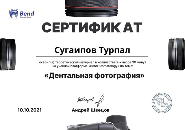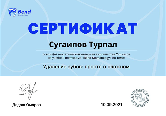 - В 2021 г проходил первичную аккредитацию специалитета «Стоматология хирургическая» при ФГБУ ДП «Центральная государственная медицинская академия» Управления делами Президента Российской Федерации.