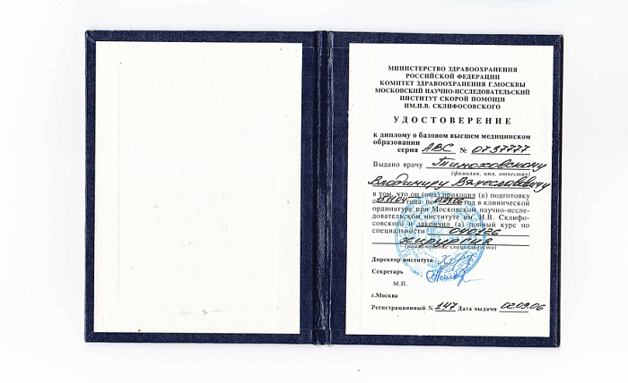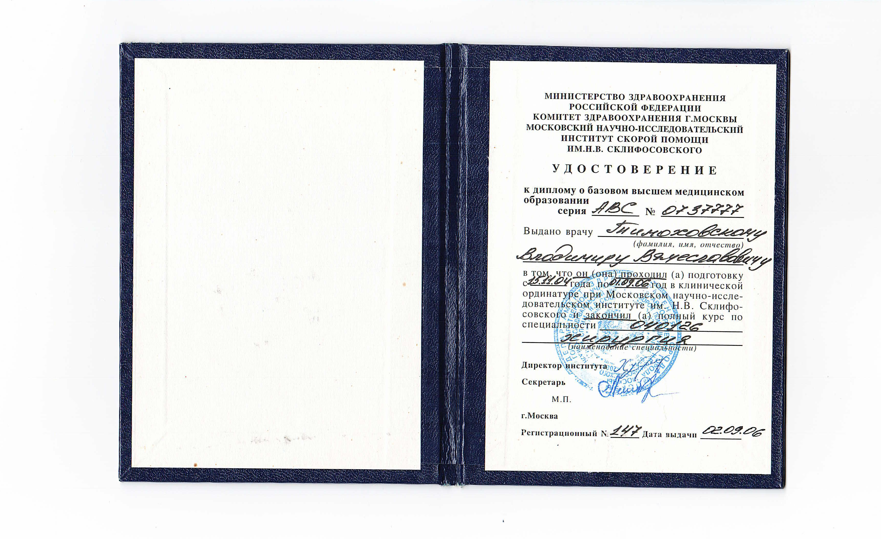 2004 - 2006 г.г., – Клиническая ординатура по специальности «Хирургия» НИИ СП им. Н.В. Склифосовского.