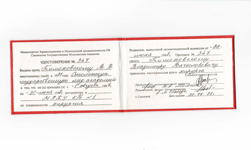 1997 - 1998 г.г., – Клиническая интернатура по специальности «Хирургия» МЛПУ клиническая больница №1, г. Смоленск;