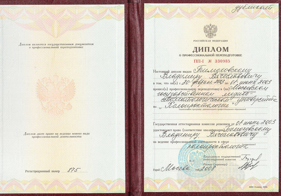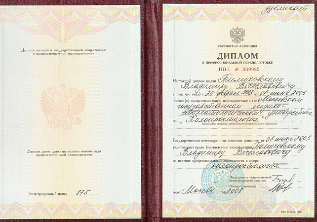 2003 г. – Профессиональная переподготовка по специальности «колопроктология». Государственный медико-стоматологический университет, г. Москва;