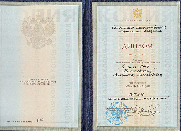 1991 - 1997 г.г., – Смоленская государственная медицинская академия факультет «Лечебное дело»;