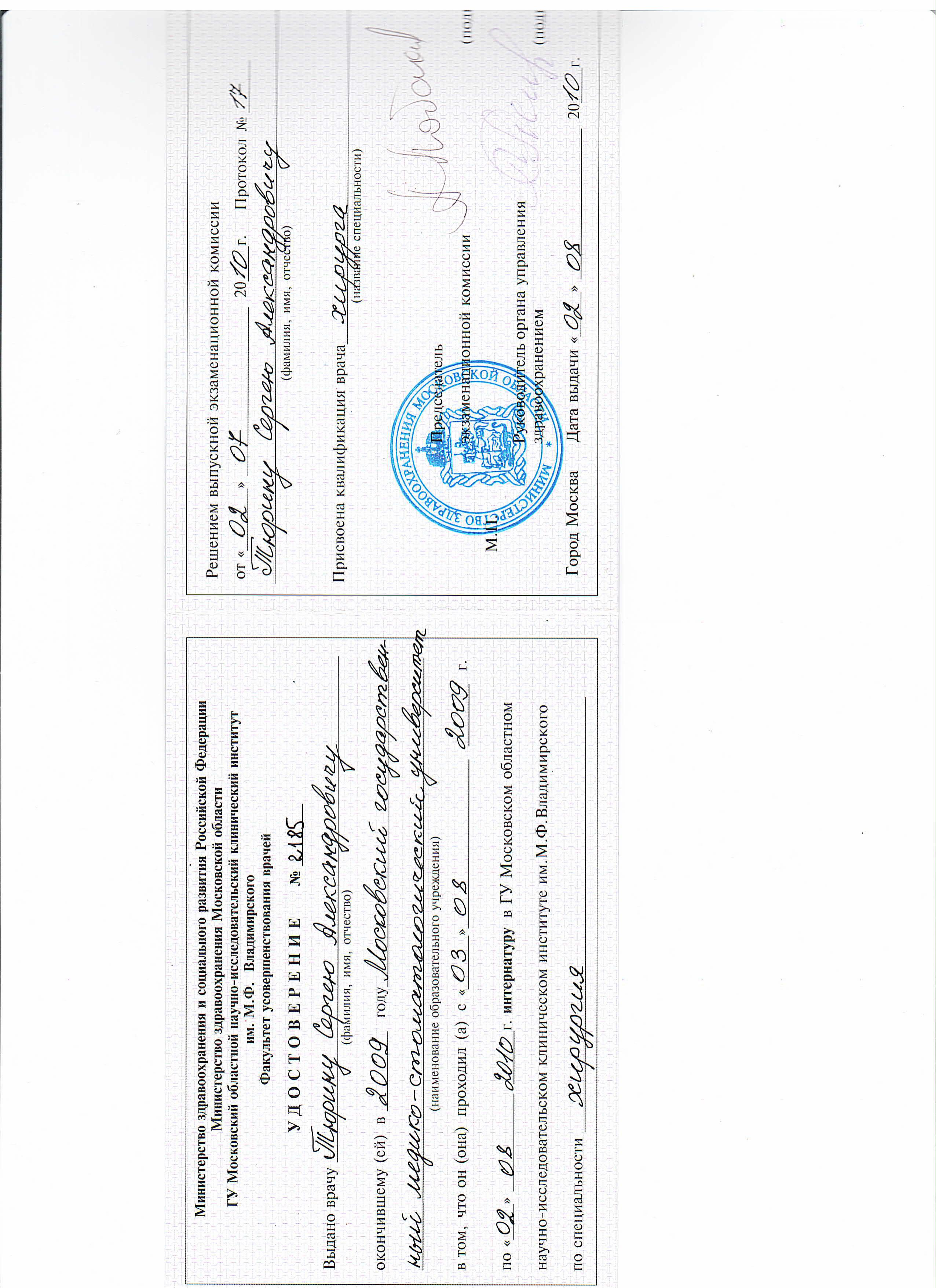 - 2010 г. - Интернатура по специальности «Хирургия» в МОНИКИ им. М.Ф. Владимирского.