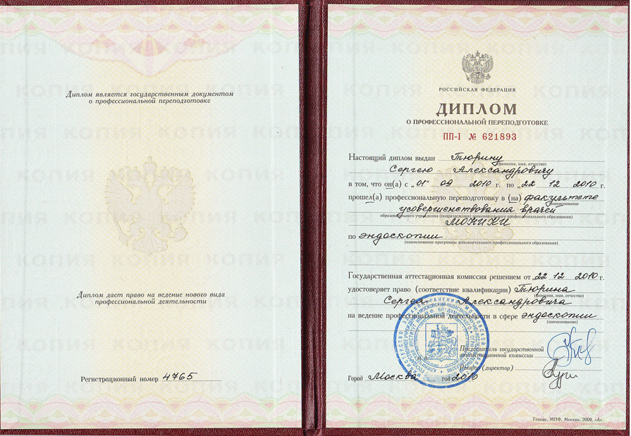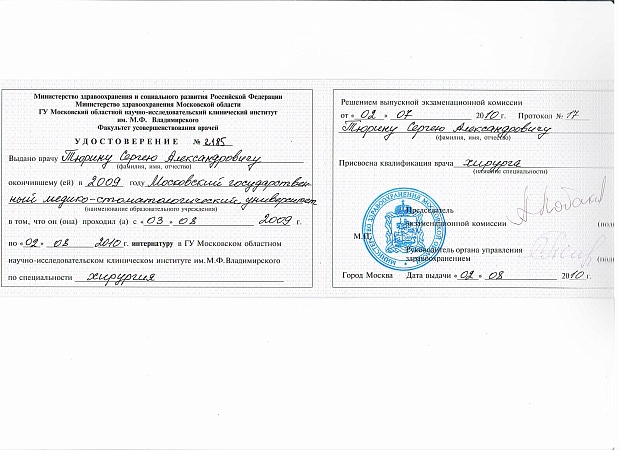 - 2010 г. - Переподготовка по специальности «Эндоскопия» в МОНИКИ им. М.Ф. Владимирского.