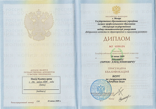 - 2009 г. - Московский государственный медико-стоматологический университет им. Н.А. Семашко, лечебный факультет.
