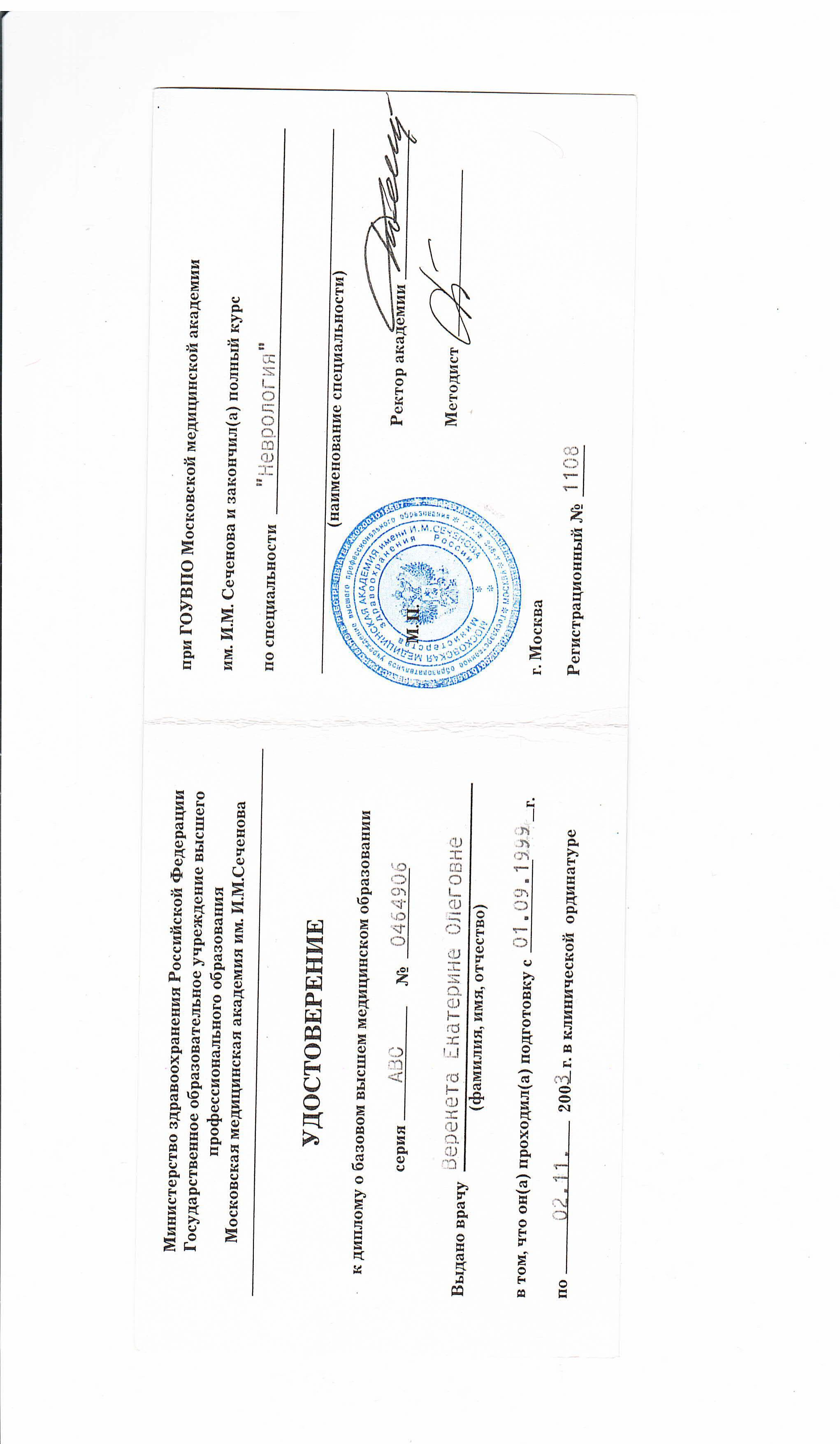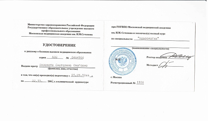 - 2003 г. - Клиническая ординатура по специальности «Неврология» на кафедре нервных болезней лечебного факультета ММА им. И.М. Сеченова.