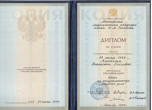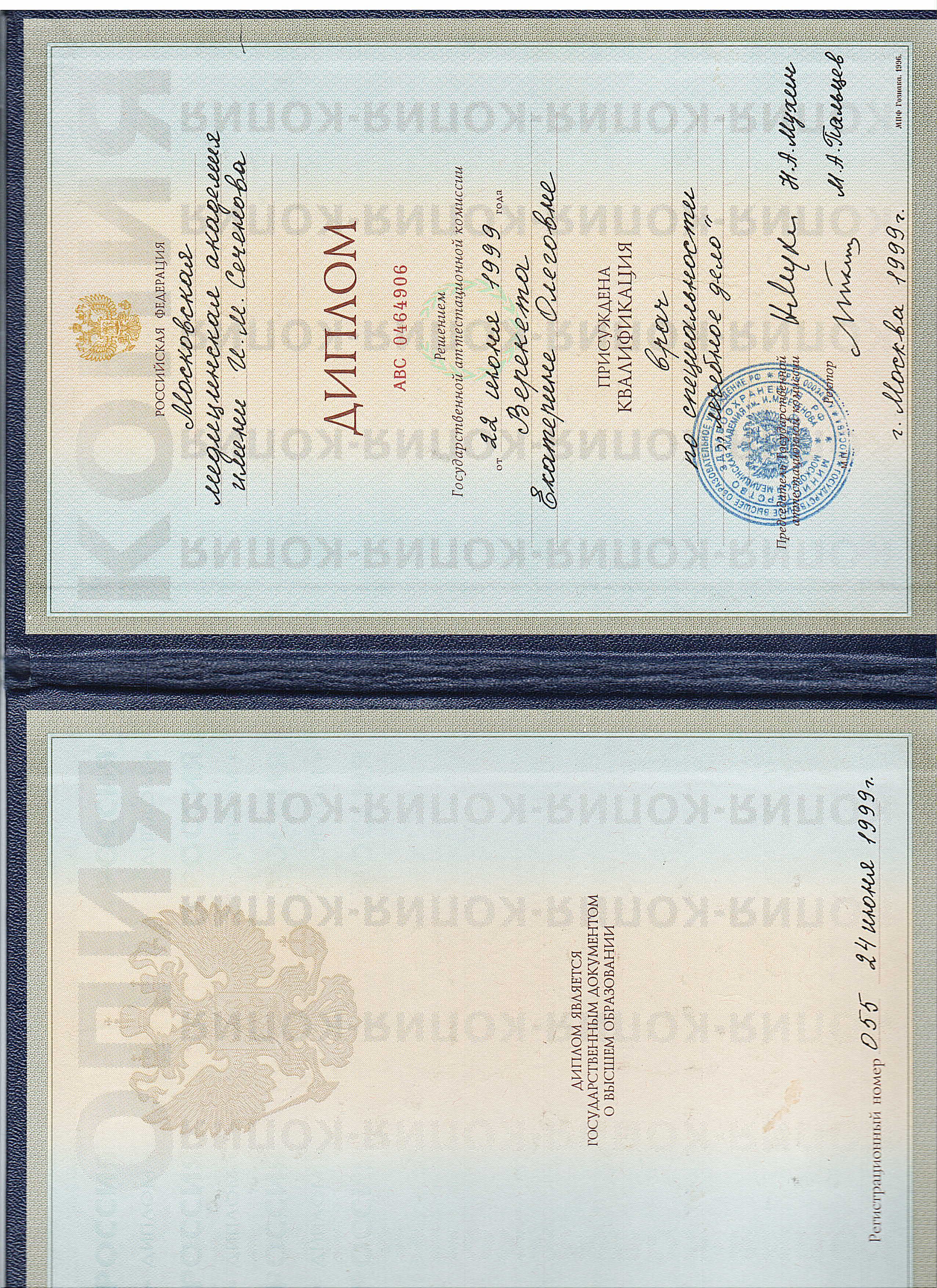 - 1999 г. - Московская медицинская академия им И.М. Сеченова по специальности «Лечебное дело»;